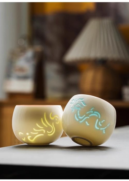 High-transmittance Ice Jade Porcelain Kung Fu Tea Cup with Embossed Flying Dragon