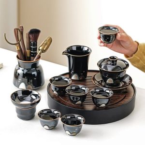 Mountain Pattern Glossy Black Glaze Porcelain Antique Gaiwan Tea Set