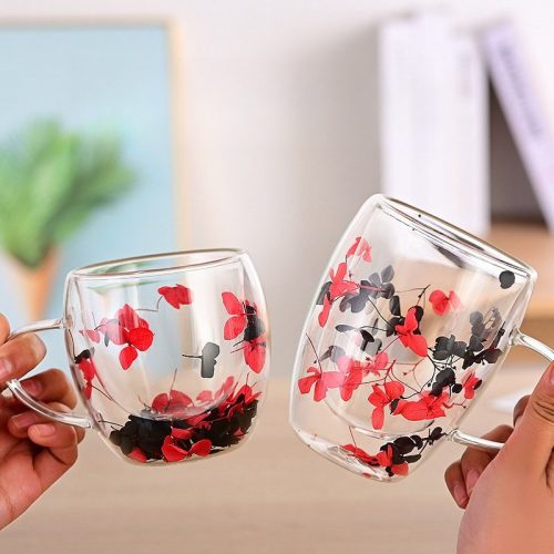 Creative Vacuum Double-Wall Glass Tea Cup with Dried Flowers