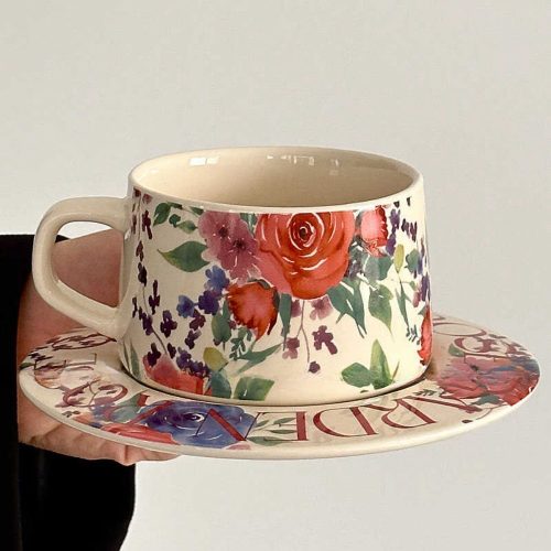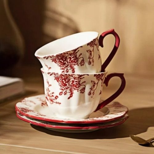 Classic Vintage Ceramic Hand-painted Red Rose Pattern Mug Tea Cup and Saucer