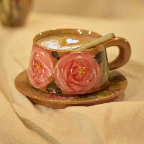 Handmade Pink Rose Pigment Extraction Colord Glaze Tea Cups and Saucers
