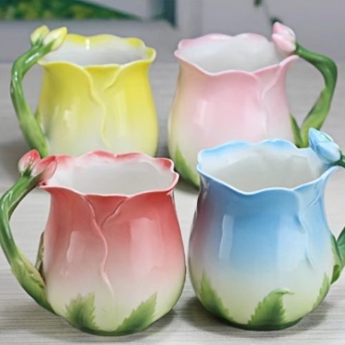 Creative Hand-kneaded Pink Rose Shaped English Tea Cup Mug with Lid and Vine Handle