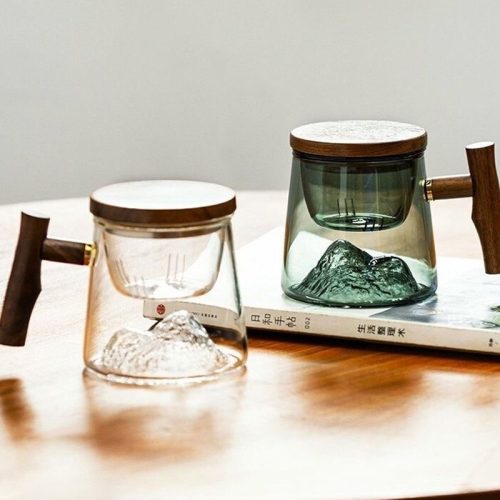 WoodenHandle Viewing Mountain Grey Borosilicate Glass Tea Cup with Infuser Mug