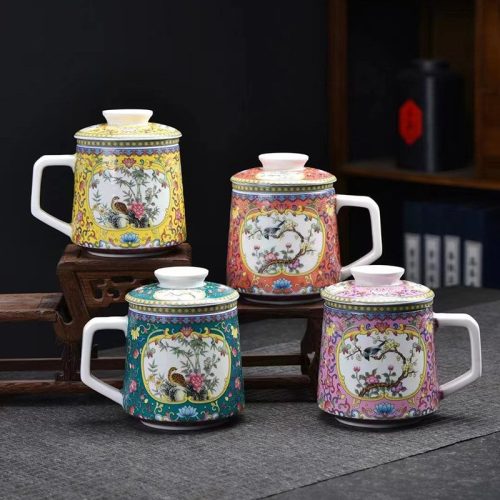 Enamel Lotus Scroll Pattern Chinese Porcelain Tea Cups Mug With Lid and Infuser