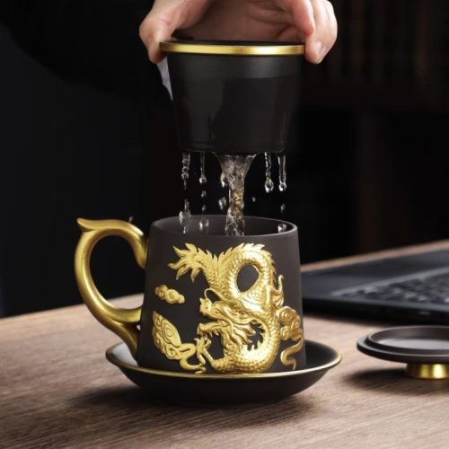 Delicate Inlaid Gold Auspicious Dragon Purple Clay Tea Cup Mug with Infuser