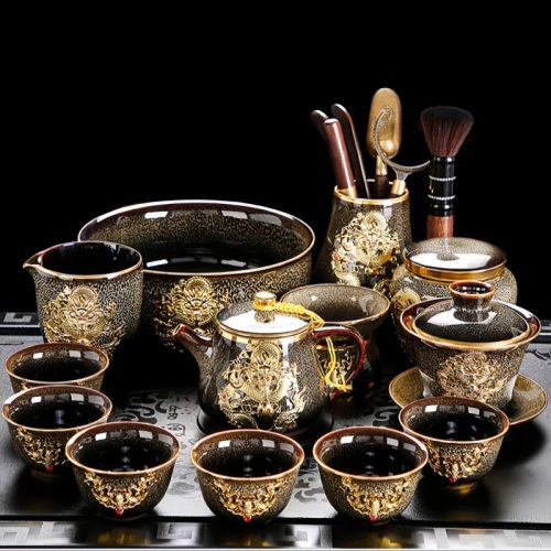 Luxury Chinese Gongfu Tea Cup Set with Colored Glaze and Gold Dragon Figurine in Ink Painting Style