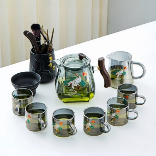 Crane Themed Antique Borosilicate Grey Glass Tea Ceremony Set for Adults