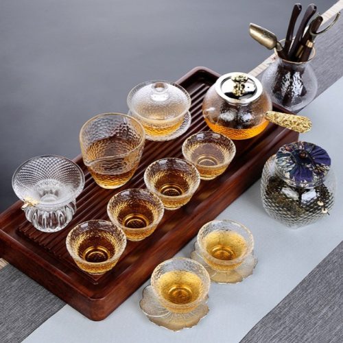 Borosilicate Hammered Glass Tea Set with Hollow Golden Lateral Handle