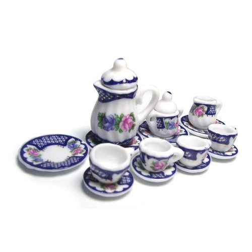 Vintage White and Blue Porcelain Miniature Cute Tea Set for Kids 15 Pcs/Set