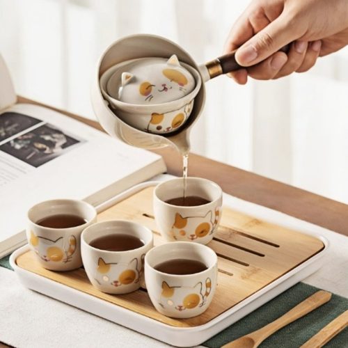 Hand-drawn Cute Cat Portable Ceramic Beige Travel Tea Set with Case