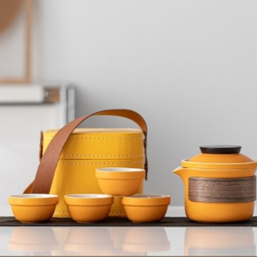 Orange Ceramic Wooden Insulation Travelling Portable Tea Set with Case