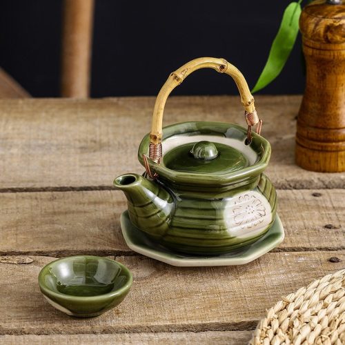 Green Ceramic Vintage Authentic Handmade Japanese Tea Kettle Set with Bamboo Handle