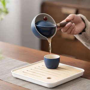 The teapot and teacups are made of high-quality ceramic, designed with traditional Chinese aesthetics in mind. The soft, light blue glaze, along with intricate detailing, enhances the visual appeal of the set. The innovative rotating feature of the teapot adds functionality to the set, ensuring an easy pour and precise control. Whether you’re brewing your tea solo or sharing with friends, this design helps you maintain the elegance of a Gongfu tea ceremony.