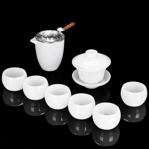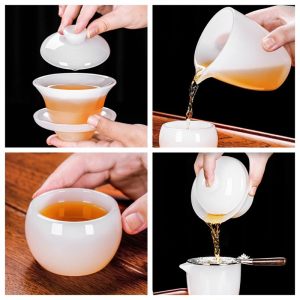 This Gaiwan tea set is beautifully crafted using a gentle white jade-colored glaze, giving it a sophisticated, refined appearance. The smooth surface, combined with the intricate design, makes this tea set stand out. Whether you’re looking for the best gaiwan for tea ceremonies or simply a unique piece to add to your collection, this set perfectly balances tradition and contemporary elegance. It pairs wonderfully with Chinese ceramic tea cups, enhancing the aesthetic and experience of tea-drinking.