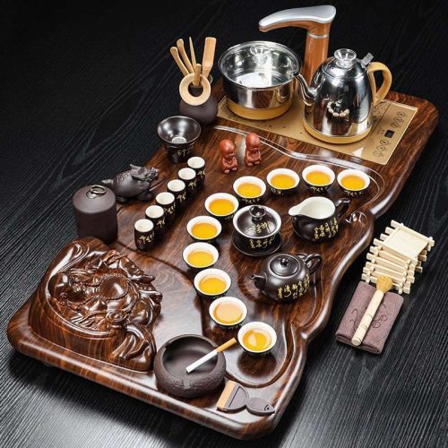This set includes all the essential tools needed for an authentic Gongfu tea ceremony. The tea infuser ensures that tea leaves stay inside the teapot, preventing them from floating freely in the tea. The tea tray offers a large and elegant surface to keep all your tea accessories organized and catch any spills during the brewing process. Additionally, the tea washer helps maintain the cleanliness of your utensils, while the tea caddy allows you to store your tea leaves properly, ensuring they remain fresh. If you’re looking for more specialized sets, our Chinese dragon tea set collection offers unique designs with a powerful symbolism.