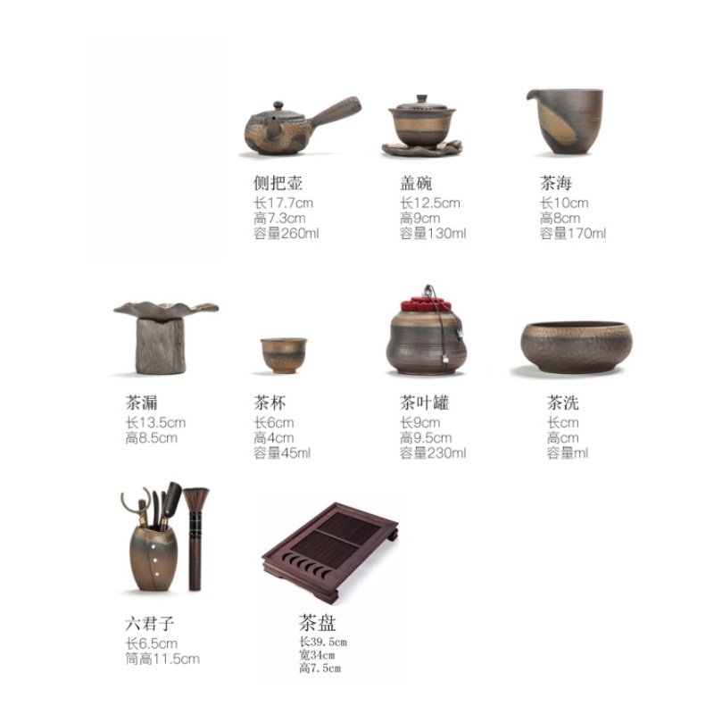 The Antique Classic Rust Glaze Pottery Kung Fu Tea Service Set with Rustic Wooden Tray includes a teapot, teacups, gaiwan, tea infuser, and wooden tray, offering a complete Gongfu tea brewing experience with an antique and rustic design.