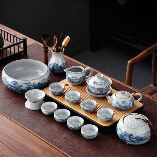 This tea set features rust glaze pottery that gives each piece a unique and earthy appearance. The glazing technique brings out the natural textures of the pottery, giving it a rugged, antique feel that is perfect for those who appreciate handmade craftsmanship. The rustic colors of the glaze are complemented by the beautiful, rich tones of the wooden tray, making this set a visual delight for both tea ceremonies and display. If you appreciate intricate designs, our Chinese porcelain tea sets collection may also appeal to you with their refined beauty.