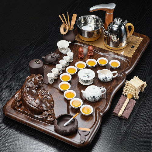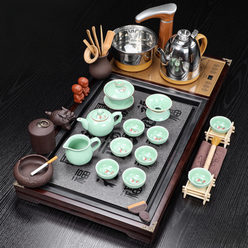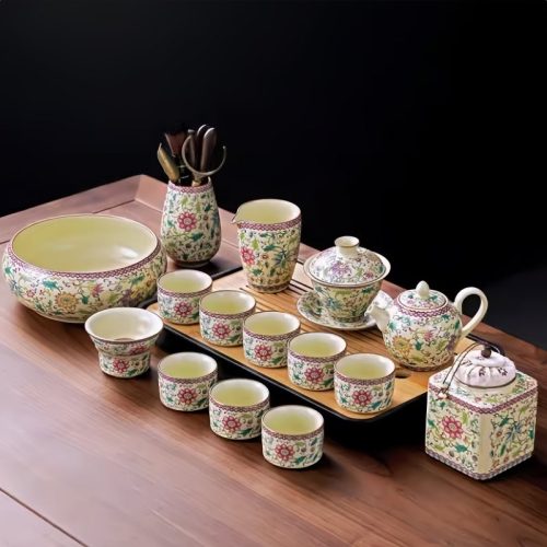 This set includes all the essential tools needed for an authentic Gongfu tea ceremony. The tea infuser ensures that tea leaves stay inside the teapot, preventing them from floating freely in the tea. The tea tray offers a large and elegant surface to keep all your tea accessories organized and catch any spills during the brewing process. Additionally, the tea washer helps maintain the cleanliness of your utensils, while the tea caddy allows you to store your tea leaves properly, ensuring they remain fresh. If you’re looking for more specialized sets, our Chinese dragon tea set collection offers unique designs with a powerful symbolism.