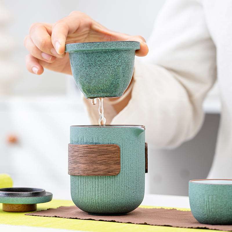 Antique Green Stone Glaze Ceramic Portable Travel Tea Set Case