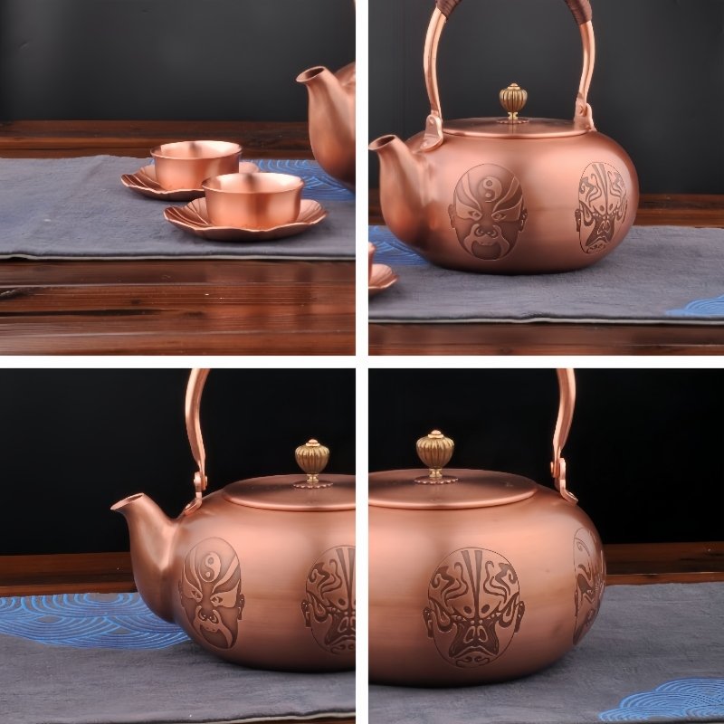 The Antique Large Capacity Handmade Solid Copper Teapot with Classic Facial Masks Pattern is a remarkable combination of art and functionality. This stunning teapot is handcrafted from high-quality copper, and it features intricate facial masks that are culturally significant in many traditions, particularly within Chinese art. These masks symbolize power, protection, and ancestral spirits, adding a layer of meaning to your tea experience. If you appreciate traditional designs, this antique copper tea kettle is an ideal addition to your collection.