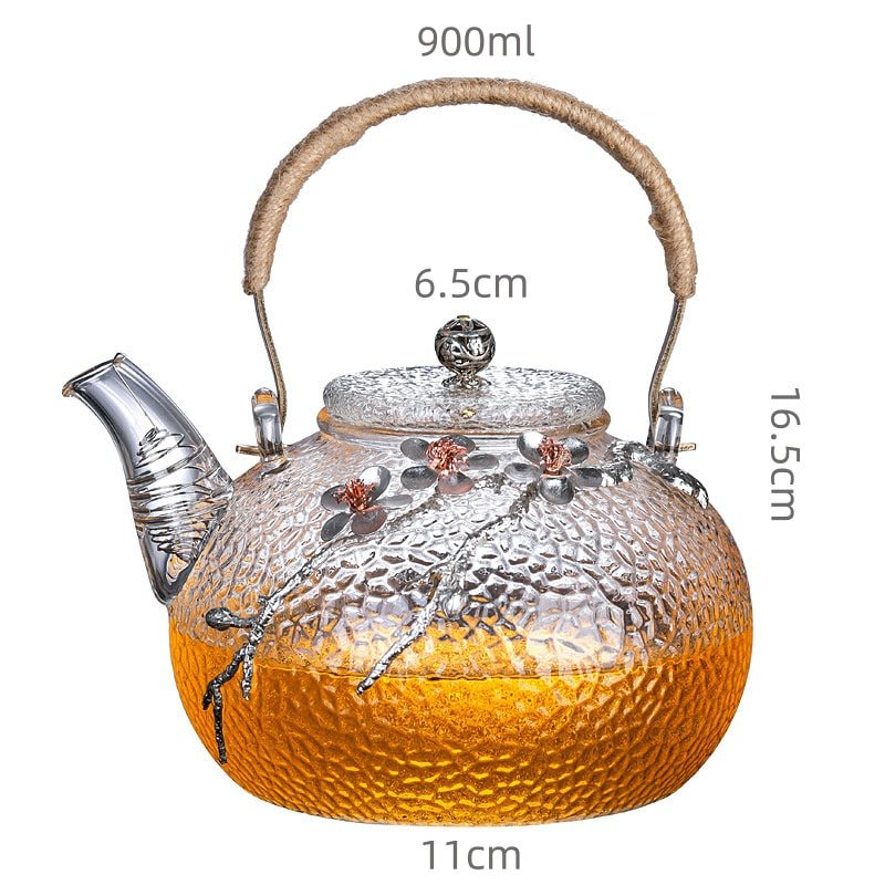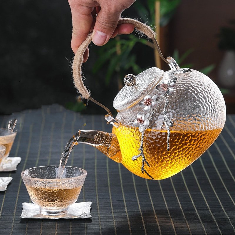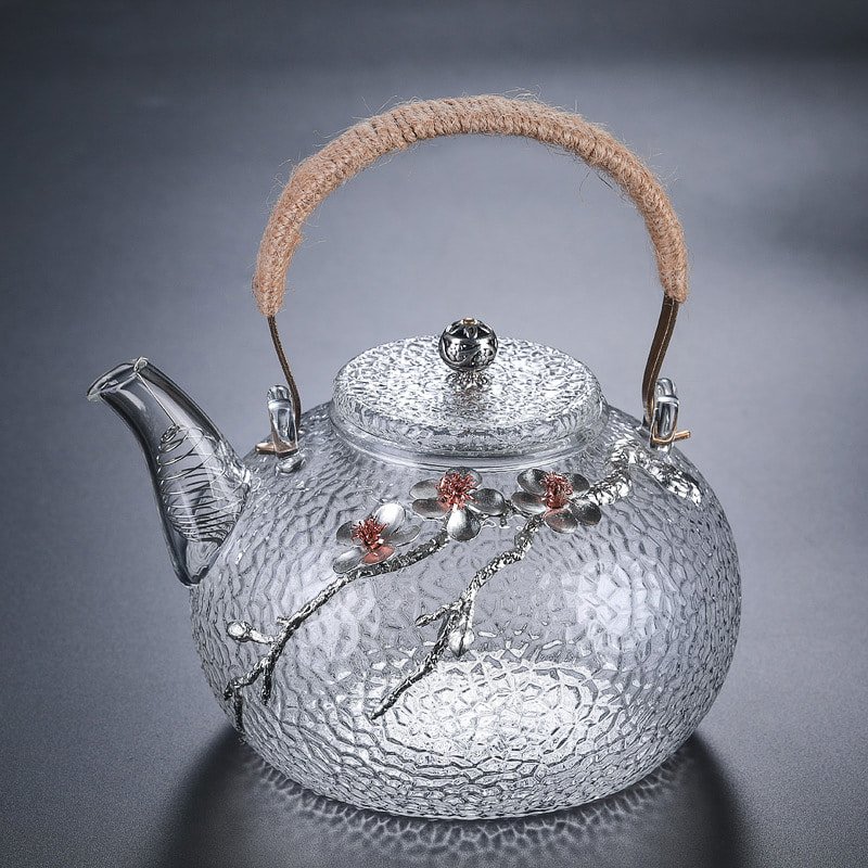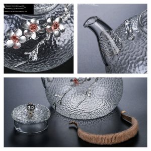 Crafted with an antique plum silver-gilded design, this teapot combines beauty and function. The intricate detailing on the lid, complete with silver accents, gives it an artistic flair. The glass teapot is perfect for brewing your favorite teas, especially blooming teas. The transparent design allows you to witness the blooming process firsthand, which adds a captivating element to your tea-drinking experience.