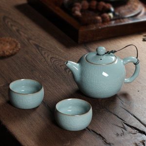 The teapot and cups are adorned with a mesmerizing blue ice crackle glaze, a hallmark of traditional Chinese porcelain artistry. This distinctive design reflects light beautifully, creating an intricate network of patterns that make each piece unique. A must-have for any collector of Chinese teapot.