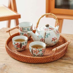 The teapot features a rattan woven bamboo handle, which adds a touch of rustic elegance to the set. Bamboo is known for its lightweight yet durable qualities, making it an ideal material for the handle. The woven rattan also ensures a comfortable grip, allowing for easy pouring of your tea. This handle design not only enhances the visual appeal but also adds practicality, ensuring a smooth tea service experience every time.