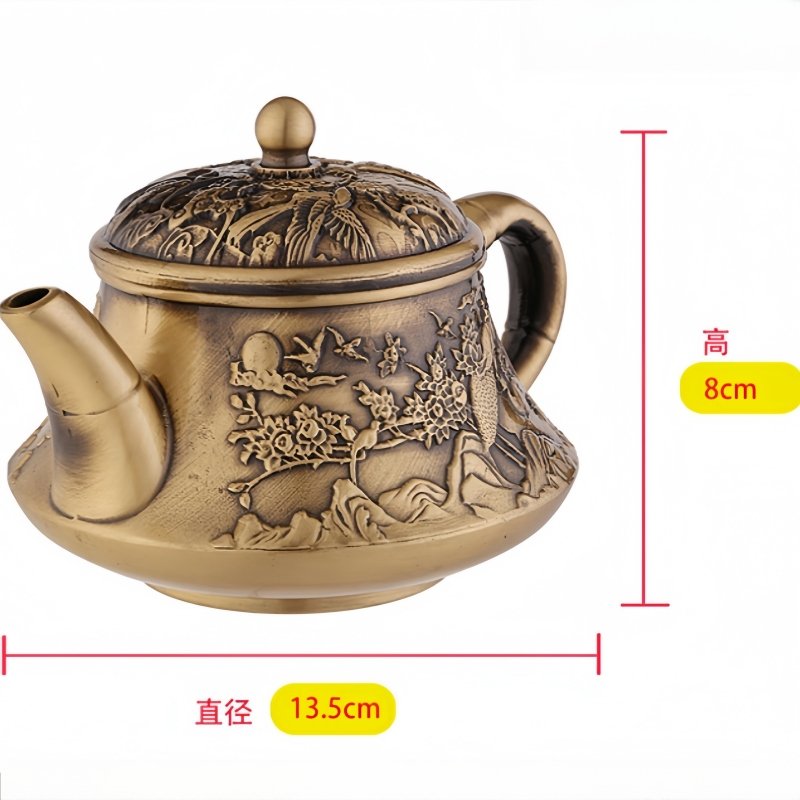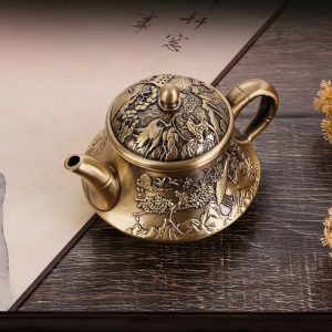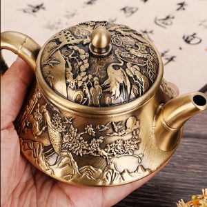 The Antique Small Brass Teapot with Embossed Landscape and Crane Pattern is a beautifully crafted piece that combines traditional artistry with functional design. This small teapot, made from high-quality brass, is adorned with a delicate landscape and crane pattern, showcasing the beauty of nature in a way that’s both sophisticated and meaningful. The crane, often a symbol of longevity and good fortune in Chinese culture, is carefully embossed into the surface of the teapot, adding both elegance and symbolic depth to its design.