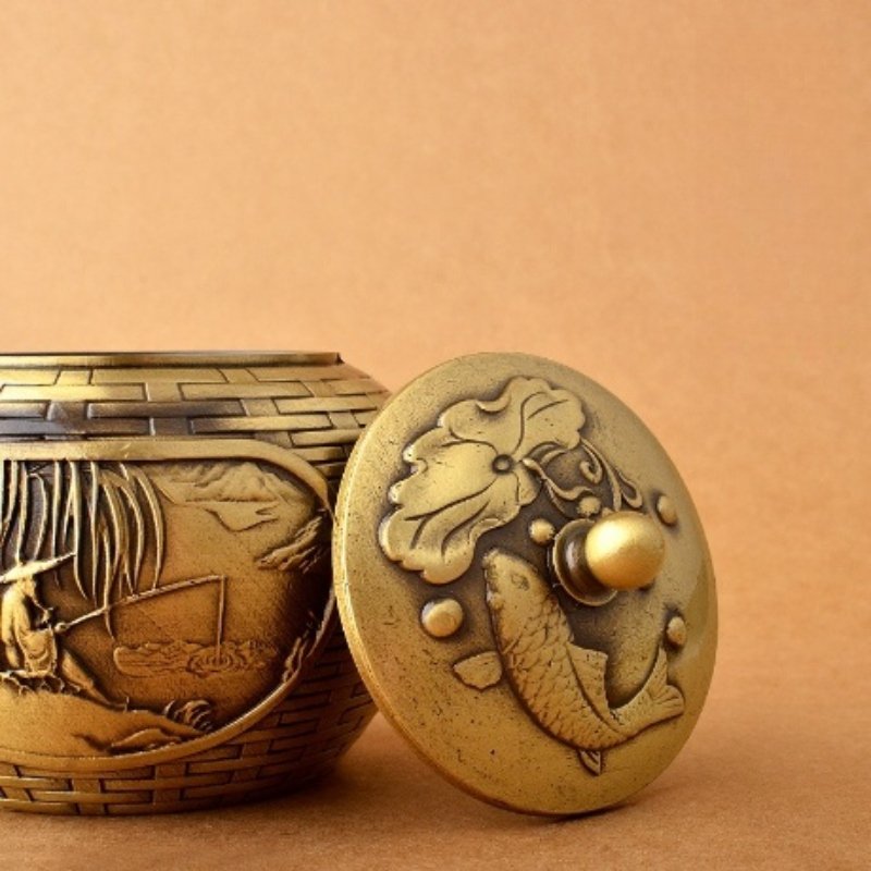 The Antique Small Handmade Brass Teapot with Old Man Fishing Theme and Weaved Design is a beautifully crafted, symbolic teapot that combines fine craftsmanship with cultural symbolism, ideal for tea lovers and collectors.