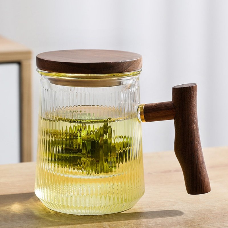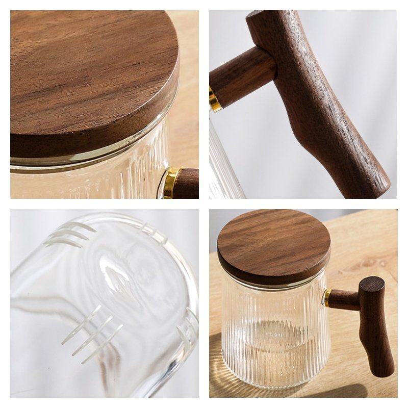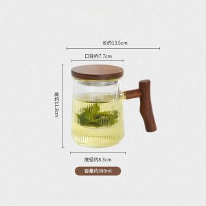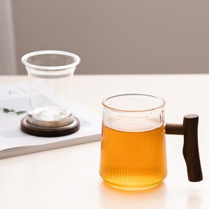 The wooden lid on this tea cup serves multiple purposes. Not only does it add a natural, earthy aesthetic to the mug, but it also helps retain heat, keeping your tea warm for longer periods. Whether you are steeping your tea or enjoying it afterward, the lid helps preserve the temperature for a more enjoyable experience. To complete your tea ritual, you can explore our modern glass tea set collection, which includes matching glassware that perfectly complements this tea cup.