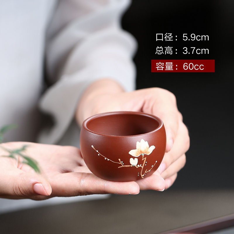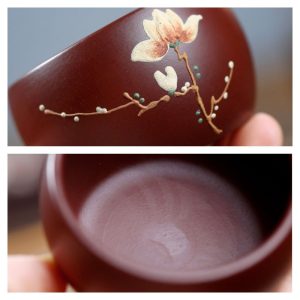The Authentic Hand-painted Magnolia Pattern Antique Yixing Zisha Teacup has a capacity of 60 ml (2.0 fl oz), making it perfect for small, concentrated servings of your favorite tea. With a diameter of 5.9 cm and a height of 3.7 cm, it provides a compact, easy-to-hold design that is ideal for traditional tea ceremonies or for sipping smaller amounts of tea throughout the day. If you’re looking for a larger tea cup, explore our chinese dragon tea cup collection for bigger and more decorative pieces.
