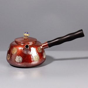 The teapot features a sturdy wooden side handle that ensures a comfortable and secure grip while pouring. The ergonomic design of the handle allows for easy pouring, making it ideal for everyday use or for serving guests during tea time. This wooden handle complements the antique copper look, adding a rustic elegance to the teapot. If you prefer a more modern take on kettle design, you may find the stainless steel tea kettle more to your liking, offering a sleek, contemporary look with ergonomic benefits.