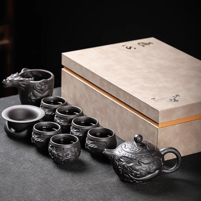 Crafted from Yixing purple clay, this tea set ensures excellent heat retention and enhances the flavor of your tea. Yixing clay is renowned for its porous nature, which absorbs the flavors of tea over time, creating a more flavorful brew with each use. The dragon tea cup set is designed to complement the unique properties of the Yixing clay, allowing tea lovers to savor the full depth of their favorite teas. This set is ideal for both traditional Gongfu tea ceremonies and daily tea rituals, providing a superior tea-drinking experience.