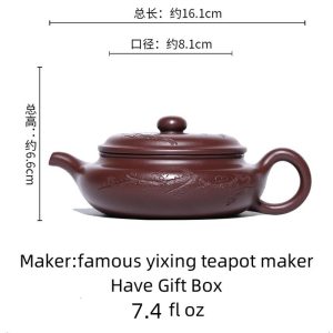 The Best Antique Flat Authentic Handmade Chinese Purple Clay Yixing Pottery Teapot is a true reflection of the elegance and artistry that defines traditional Chinese craftsmanship. This teapot is not only a vessel for brewing tea but a collector’s masterpiece. Handcrafted using Yixing purple clay, renowned for its ability to enhance the flavor and aroma of tea, this teapot is ideal for tea connoisseurs who appreciate the finest tea experiences. The Yixing purple clay has a unique porous structure that allows it to absorb the essence of tea, creating an ever-evolving flavor profile as it seasons over time.
