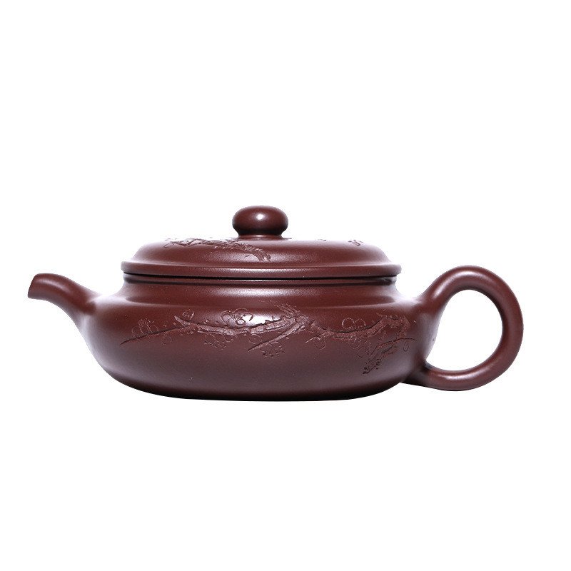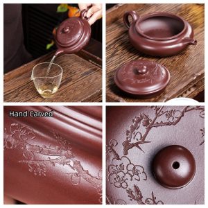 The artistry of this teapot extends beyond its functional purpose. The hand-carved floral patterns on the body of the teapot provide a visual feast, showcasing delicate branches and flowers, symbolic of nature and growth in Chinese culture. These designs are carved with such fine detail that they seem to come alive, enhancing the overall aesthetic of the teapot. This combination of artistry and functionality makes it perfect not only for tea preparation but also as a decorative piece in your collection.