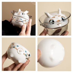 The cute little dragon design on the teapot and teacups is the highlight of this tea set. The playful dragon figure adds a touch of whimsy to the set, while the hand-painted details and gold accents lend a sense of elegance. The dragon’s friendly face and intricate patterns make it an eye-catching and charming addition to any tea lover’s collection. The delicate blue and gold hues are paired beautifully with the clean, white porcelain base, making it a visually appealing and unique tea set.
