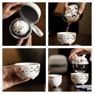 This portable tea set is perfect for Gongfu tea brewing, a traditional Chinese tea method that involves multiple infusions to extract the full flavor of the tea. The teapot’s elegant pour spout allows for precise and controlled pouring, while the two small tasting cups allow you to appreciate the depth of flavor in each brew. The larger host’s cup is ideal for savoring your tea in larger sips. The combination of the teapot, host’s cup, and tasting cups creates a complete Gongfu tea experience.