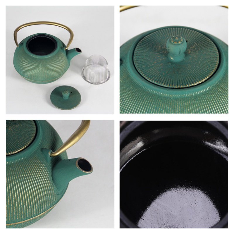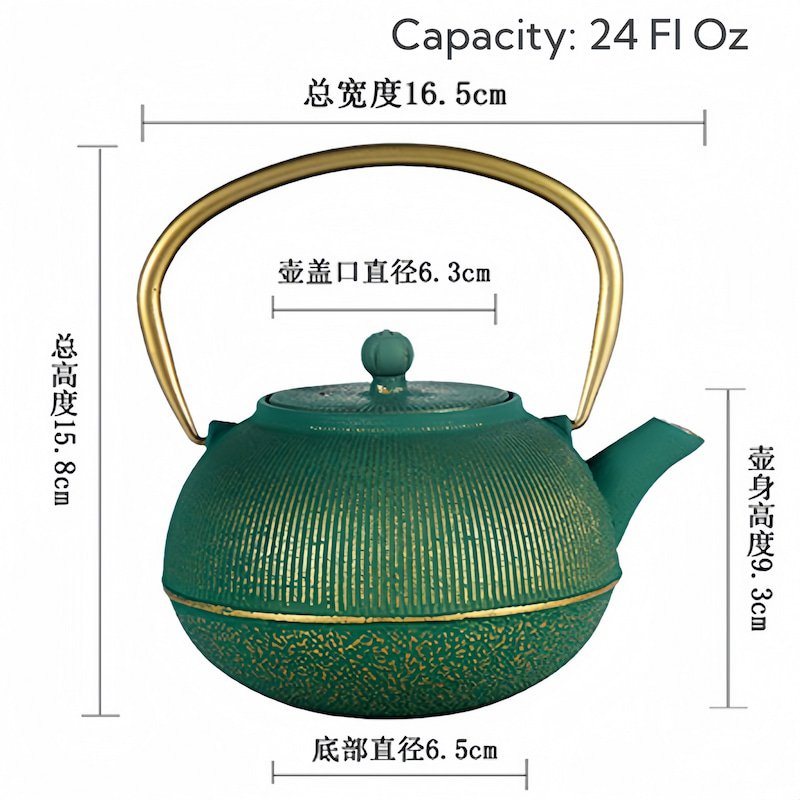 Elevate your tea experience with this beautiful 24 fl oz Green and Gold Cast Iron Enameled Tea Kettle, featuring superior heat retention, an ergonomic design, and a durable enamel coating, perfect for brewing loose leaf tea.