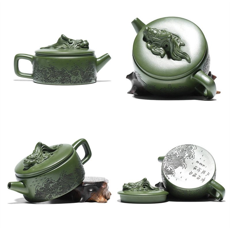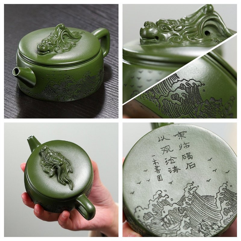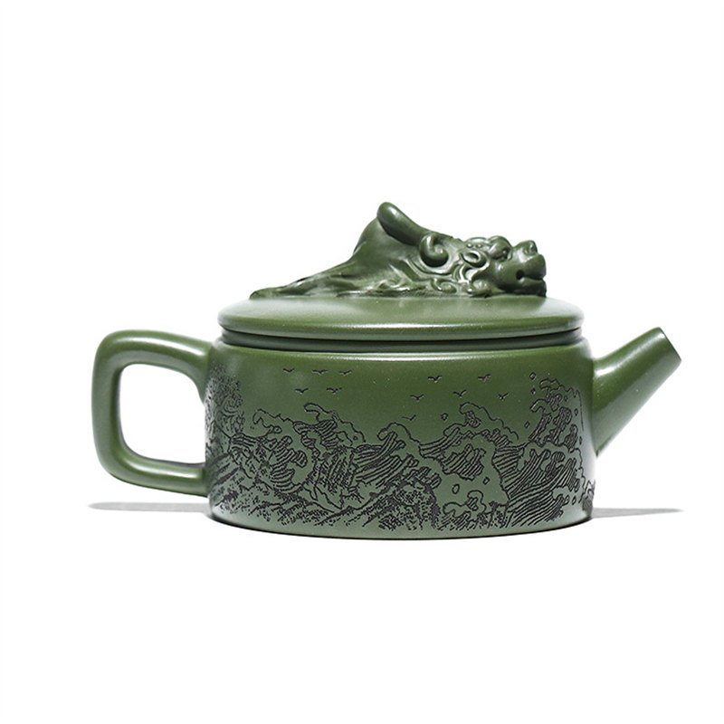 The Best Green Yixing Clay Zisha Teapot with a unique Dragon Out to Sea theme is an exceptional piece of art and functionality, crafted from the finest Yixing purple clay. Known for its durability and excellent heat retention properties, this Yixing clay is the perfect material for creating teapots that enhance the taste and aroma of your tea. This particular teapot features a striking green color, symbolizing vitality and renewal. The Dragon Out to Sea theme adds an intriguing layer of storytelling to your tea experience, evoking the image of a powerful dragon leaving the seas to explore new horizons.