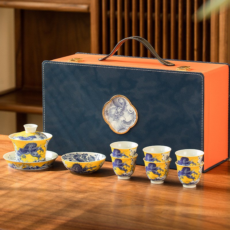 Each component of this Gaiwan tea set is delicately crafted in Jingdezhen, a region renowned for producing some of the finest porcelain in the world. The attention to detail in the hand-painted design is impeccable. The combination of vibrant yellow and blue with intricate dragon motifs adds a royal touch, symbolizing prosperity and good fortune.