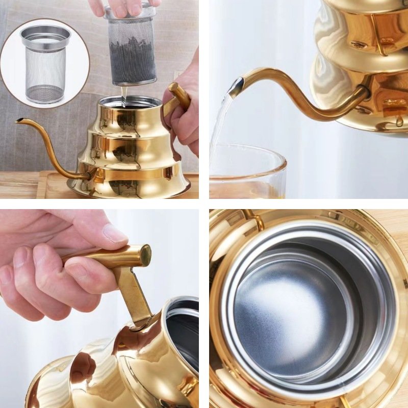 Crafted from food-grade stainless steel, this teapot is built to last and will remain rust-free even after frequent use. Its durable construction ensures heat retention, keeping your beverages hot for longer periods. The high-quality stainless steel also makes it easy to clean and maintain, ensuring your teapot stays in excellent condition for years to come. Pair this teapot with a borosilicate glass teapot for a more contemporary look or a tea infuser mug with lid for individual servings of your favorite tea.