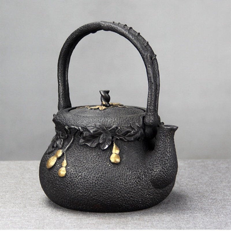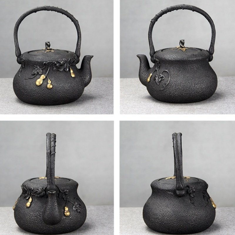 The teapot is adorned with delicate golden gourd accents, adding an extra layer of charm to its vintage look. The golden details contrast beautifully against the black surface of the cast iron, making it a statement piece for any tea lover. Whether you’re enjoying a calming cup of tea by yourself or serving tea at a gathering, the unique design is sure to impress. Pair it with a Japanese tea kettle for a more extensive tea experience that captures the essence of both traditional and contemporary styles.