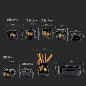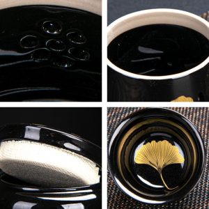 The standout feature of this tea set is the intricately painted ginkgo leaf design in gold, set against the deep black lustrous glaze. The ginkgo leaf symbolizes resilience and longevity, making it the perfect motif for a tea set that is both visually striking and filled with cultural meaning. Each piece is handcrafted to ensure a unique and personal touch, making it an exquisite addition to any collection.