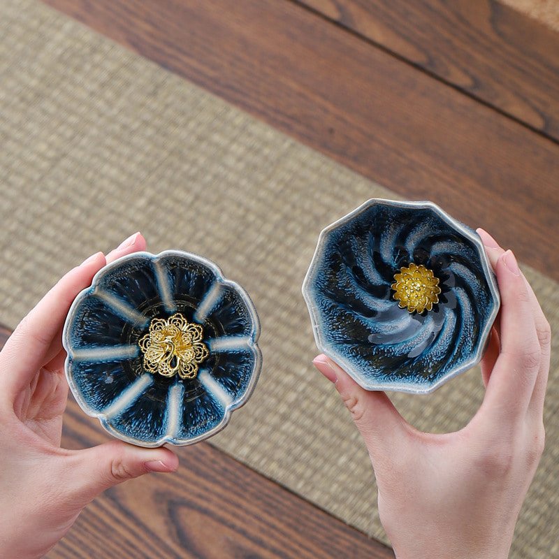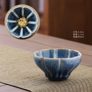 The Blue Raindrop Glaze Spiral Handmade Ceramic Tenmoku Bowl Jian Zhan Tea Cup is available in two captivating designs: the Peacock pattern and the Lotus pattern. Each design features a unique glaze and shape that brings out different aspects of the traditional Jian Zhan technique. Whether you prefer the vibrant, lively peacock design or the calm, serene lotus pattern, both variations are beautifully crafted to suit your style.