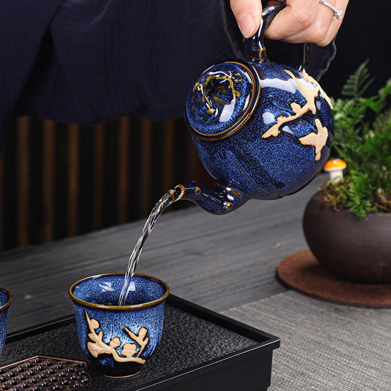 Crafted from premium ceramic, this teapot features a rich, deep blue glaze accented by golden highlights, creating a timeless and luxurious look. The embossed plum design is intricately detailed, reflecting traditional Chinese artistry. Add this to your tea essentials alongside our carefully curated Chinese tea service set to elevate your tea ritual.