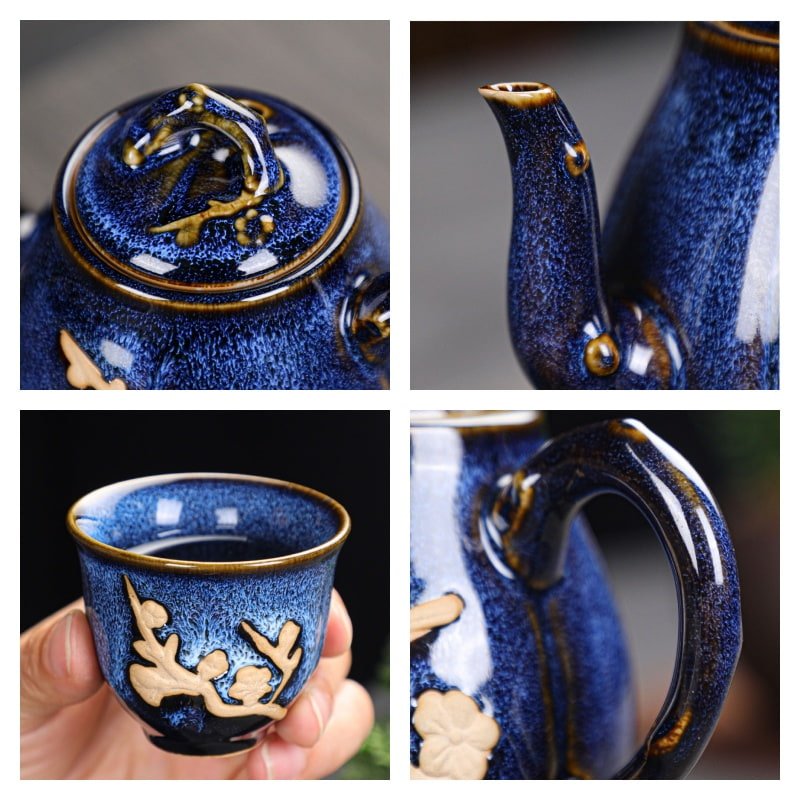 This Blue Vintage Ceramic Teapot and Cup Set combines striking aesthetics with traditional craftsmanship. The embossed plum blossom design symbolizes resilience and beauty, making this set a stunning centerpiece for tea ceremonies or casual gatherings. Enhance your collection with other exquisite options like our Chinese teapot set.