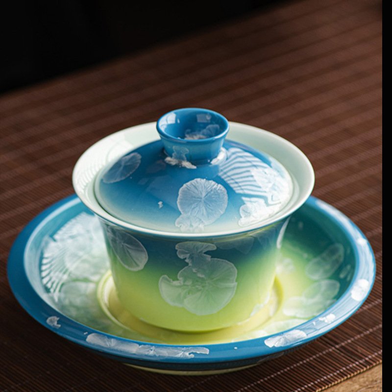 The captivating design of the gaiwan offers an artistic view that brings the tranquility of the ocean and the vastness of the night sky into your tea-drinking experience. The crystalline glaze, applied meticulously, creates unique patterns that resemble floating jellyfish and gentle ripples on the surface of the water. This artistic glaze makes the gaiwan not just a functional tool for brewing tea but also a stunning decorative piece that adds charm and elegance to your collection. Pair it with a matching Chinese tea set to create a complete tea experience.