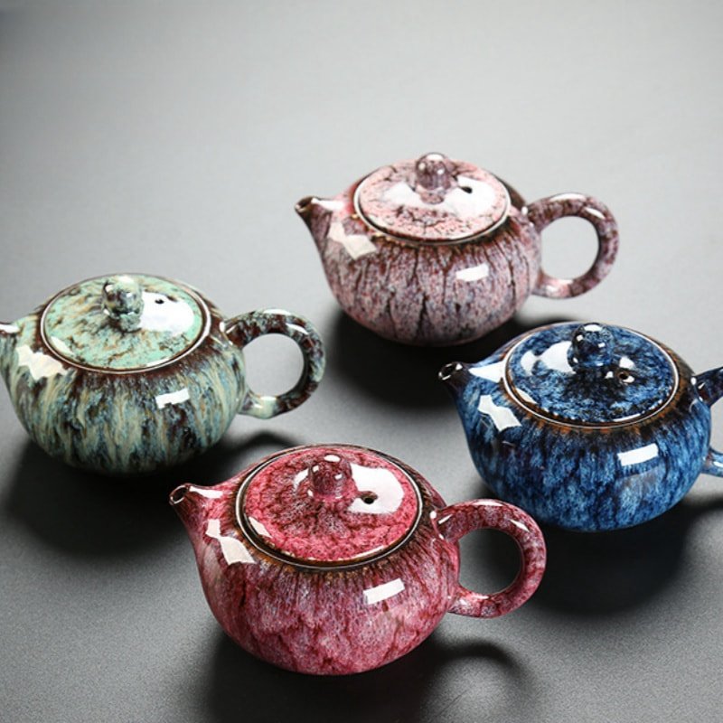 Available in multiple vibrant colors—blue, red, green, and more—this teapot complements a variety of tea sets. Each color features the mesmerizing Tenmoku glaze, ensuring your teapot is as beautiful as it is functional. Match it with Chinese porcelain tea sets or a gaiwan set for a cohesive and elegant tea setup.