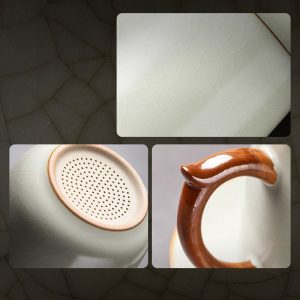 Each tea cup is meticulously crafted using ancient techniques that ensure a unique crackle pattern on the beige glaze, making every piece a one-of-a-kind work of art. The elegant design is complemented by the functional robustness of the cup, offering both beauty and longevity.