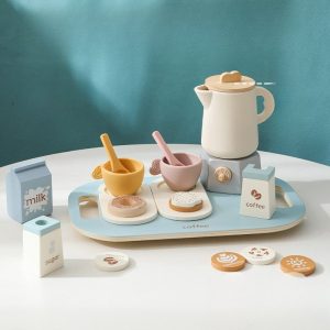 The set encourages kids to use their imagination while developing social and motor skills. They will love serving coffee, tea, milk, and treats to their guests, learning the value of sharing and hospitality. The sturdy wooden construction ensures this set is built to last and provides endless hours of playtime fun.